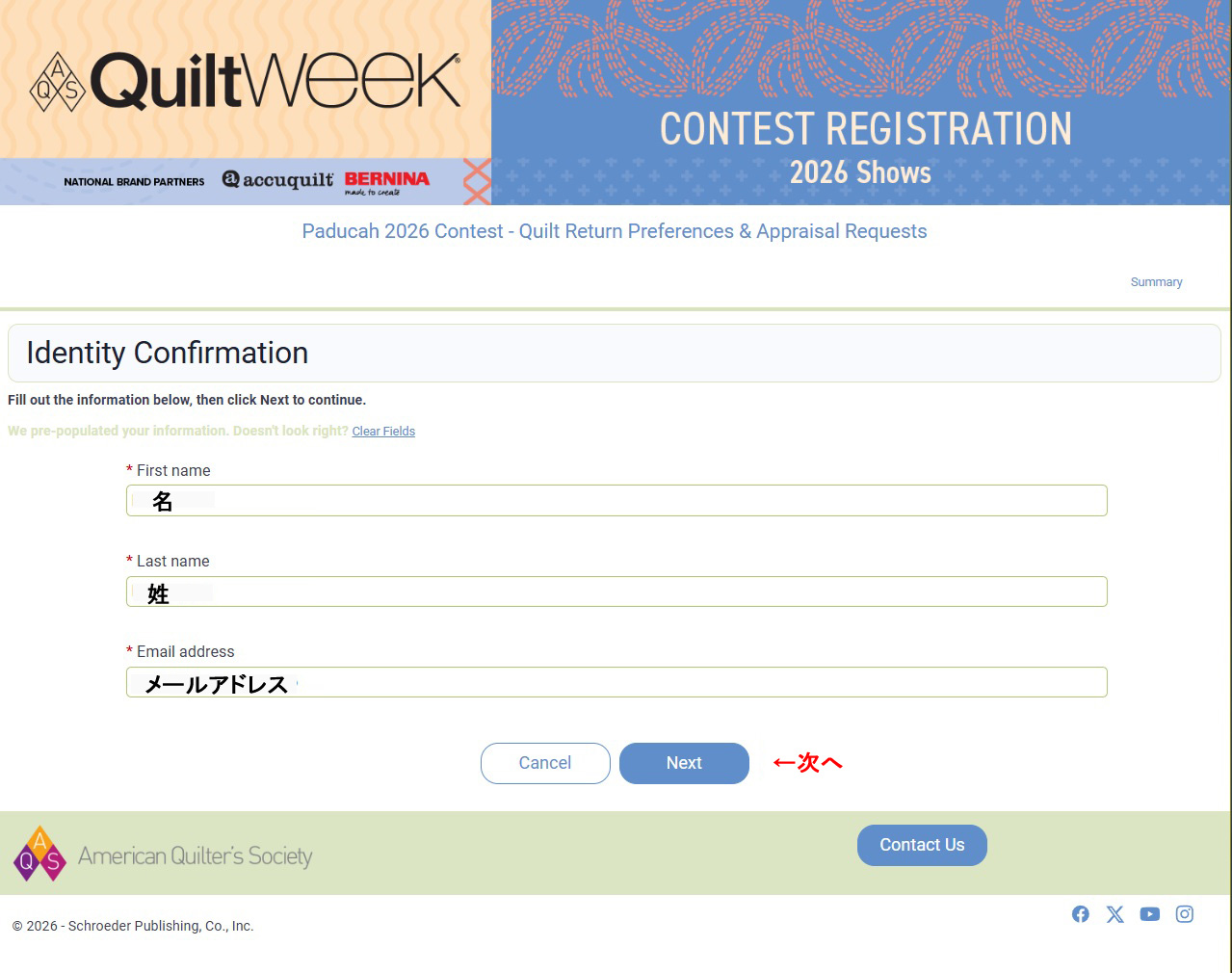 入力サイトの確認ページが開きますので、名前とメールアドレスを確認したらNEXTボタンを押して次のページに行きます。