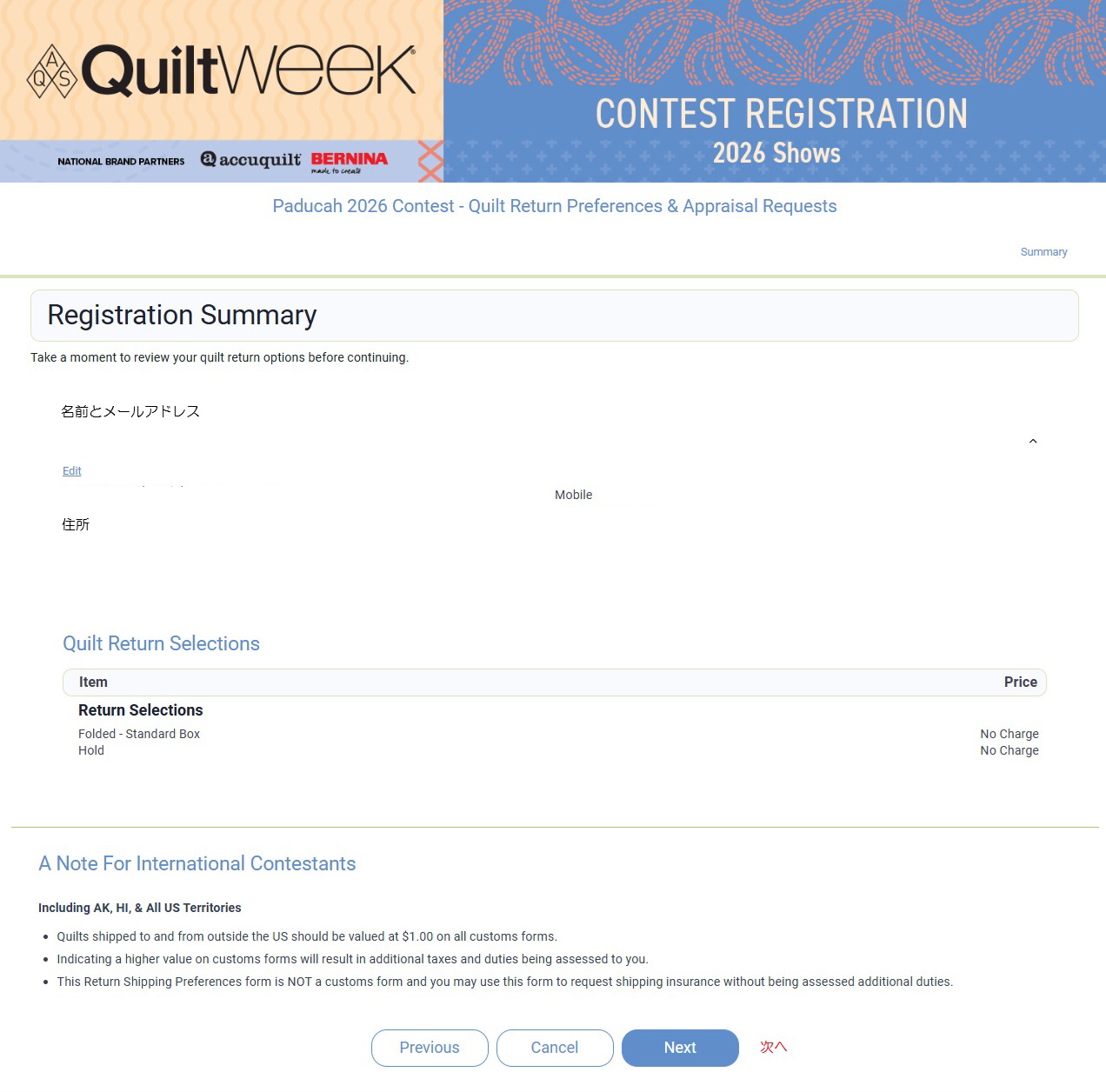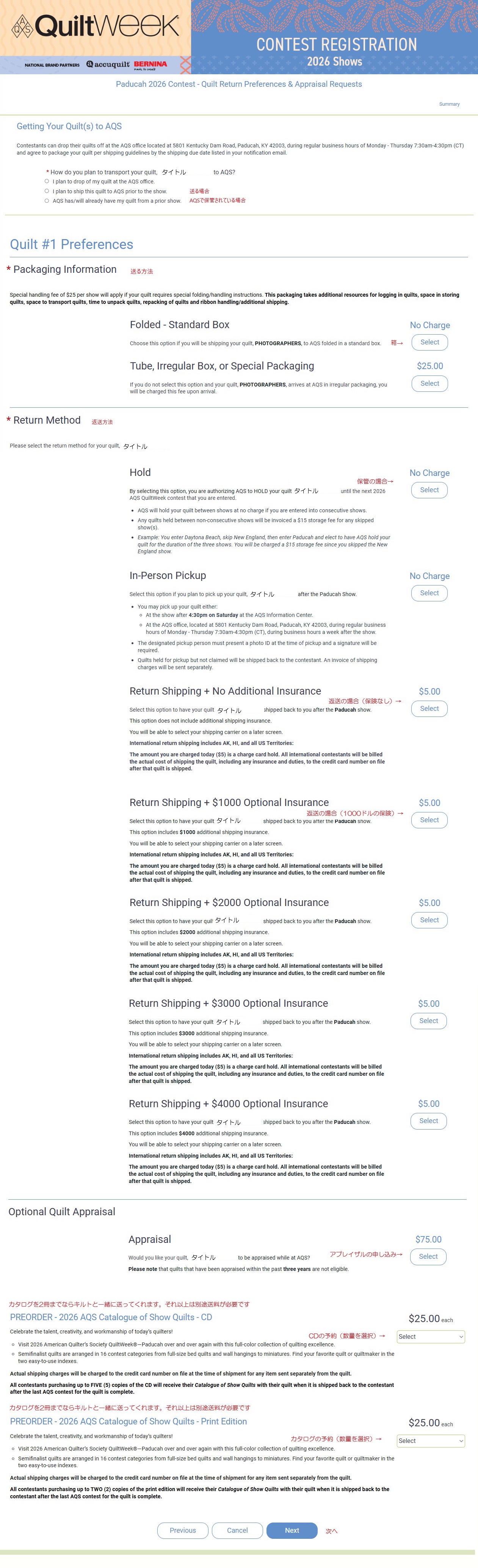 キルト展が終了し、AQSから作品が返送される時に返送料が確定します。