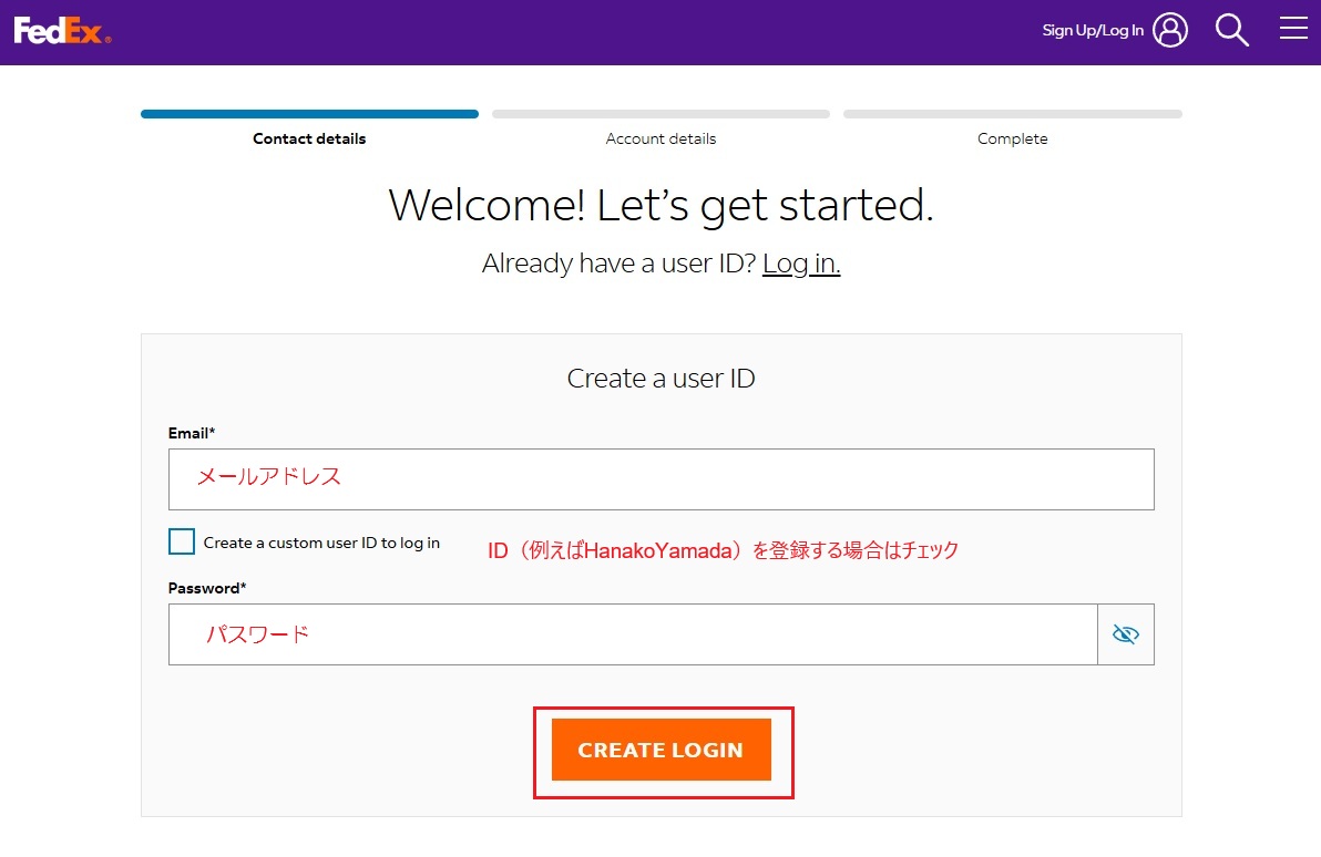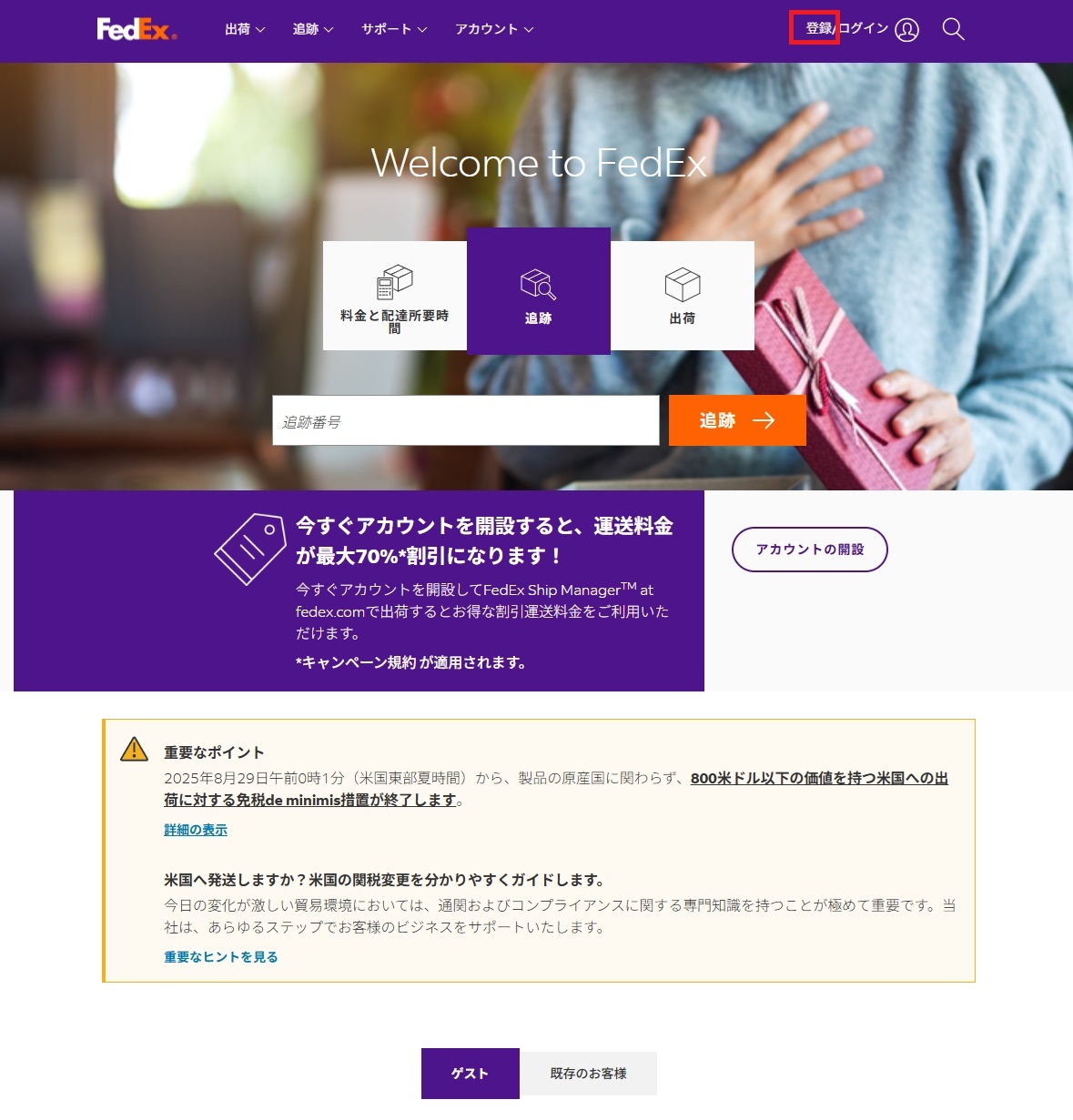 こちらをクリックしてフェデックスのホームページに行きます。登録/ログインをクリックしてください。