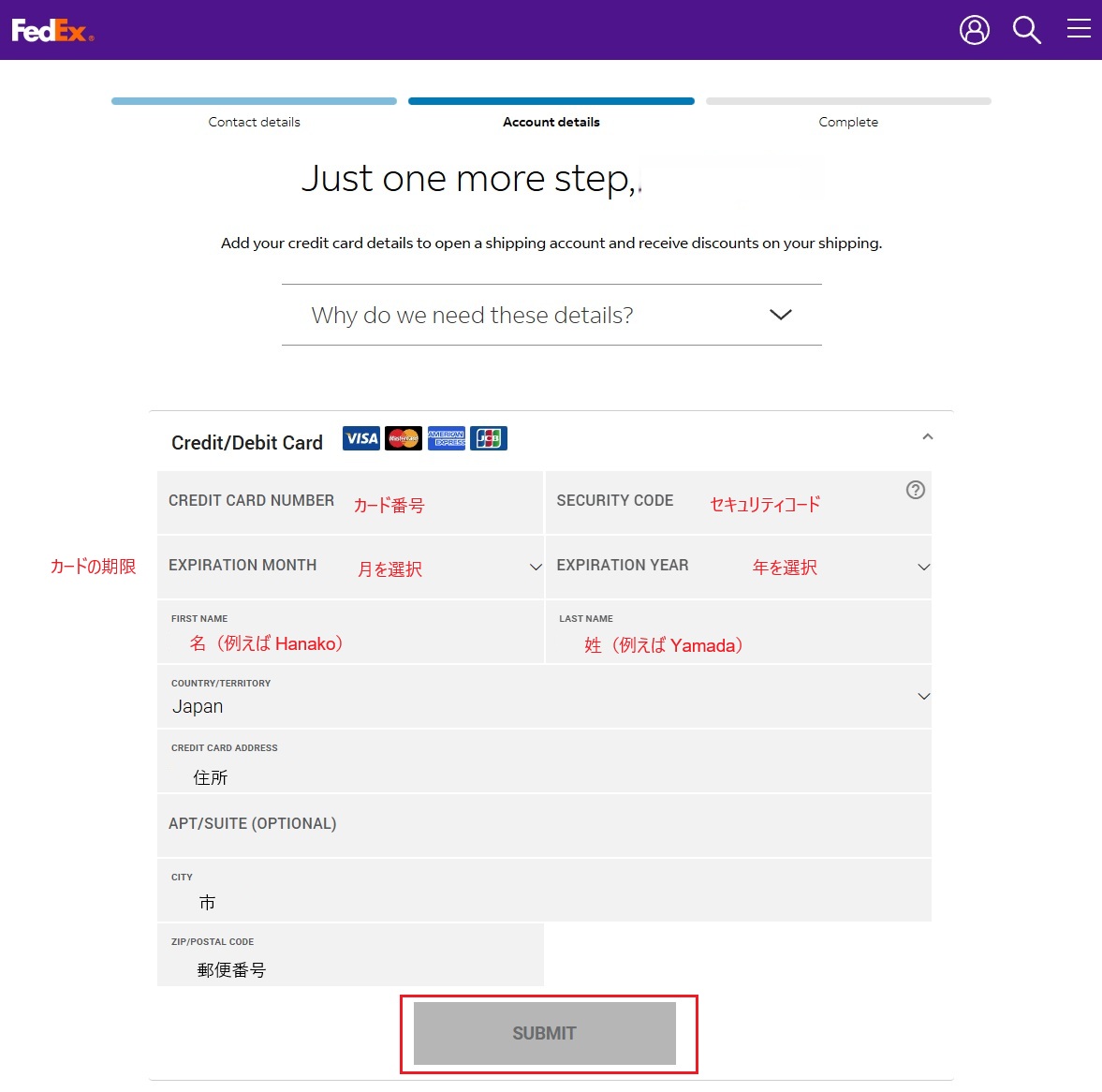 クレジットカード情報を入力し、SUBMITボタンを押します。
