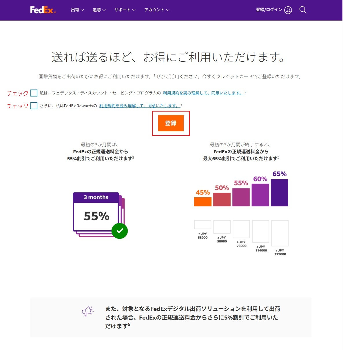 フェデックスのホームページの登録/ログインをクリックしてログインします。あるいはログインページからログインします。