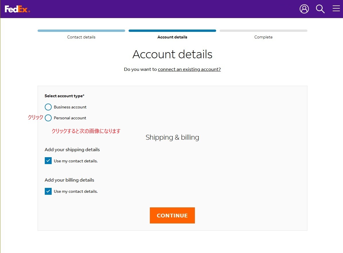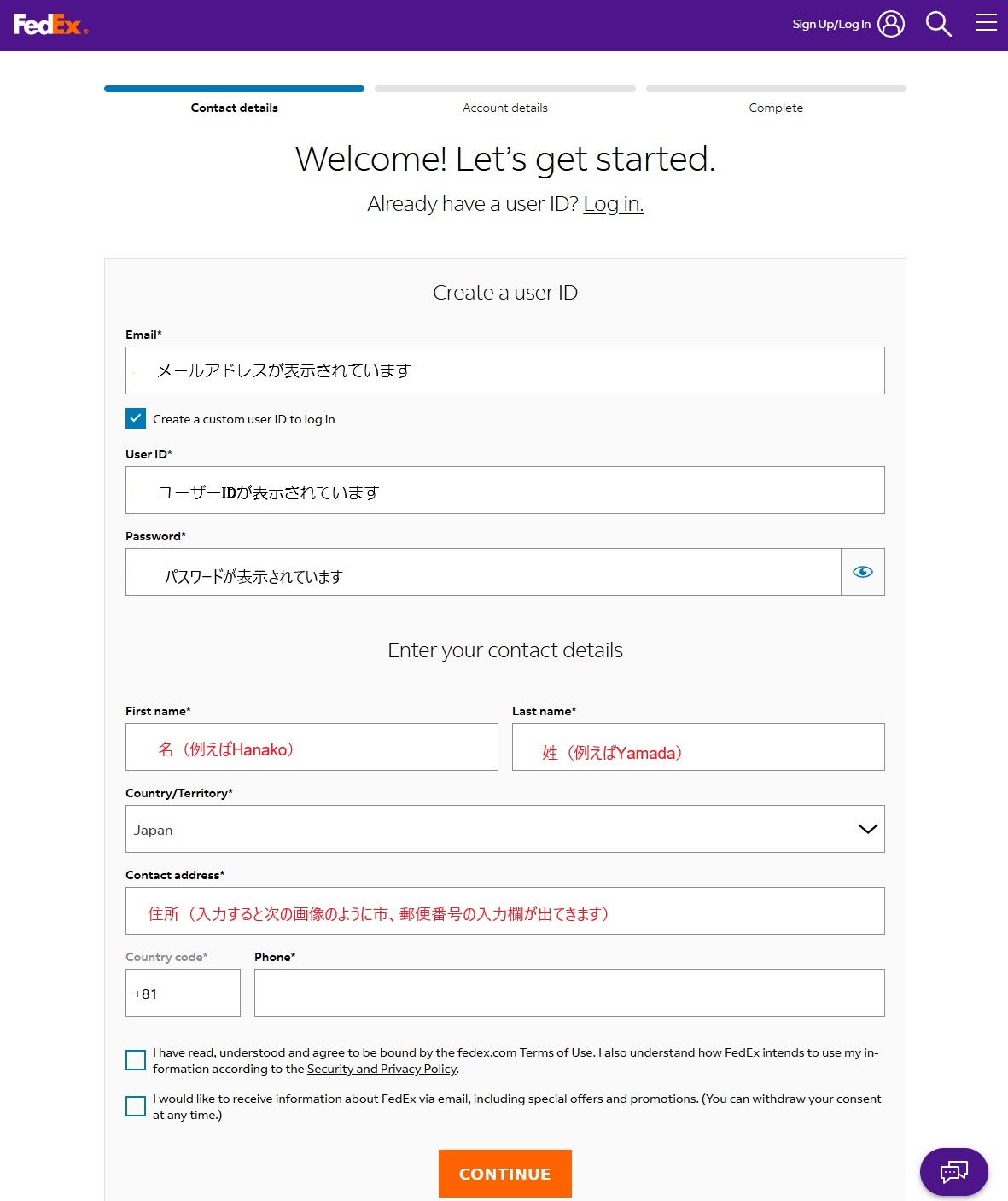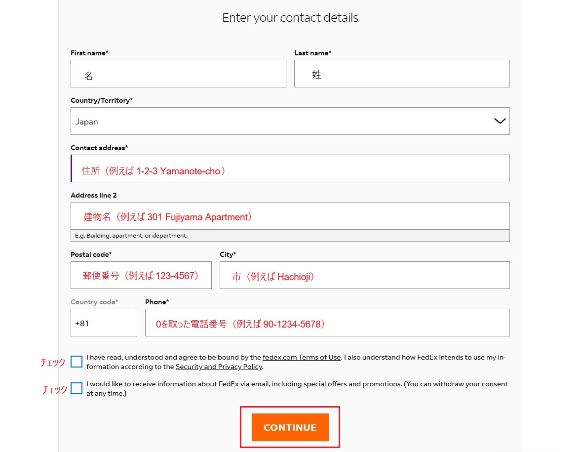 住所、電話番号等を入力し、チェック欄をクリックし、CONTINUEボタンを押します。