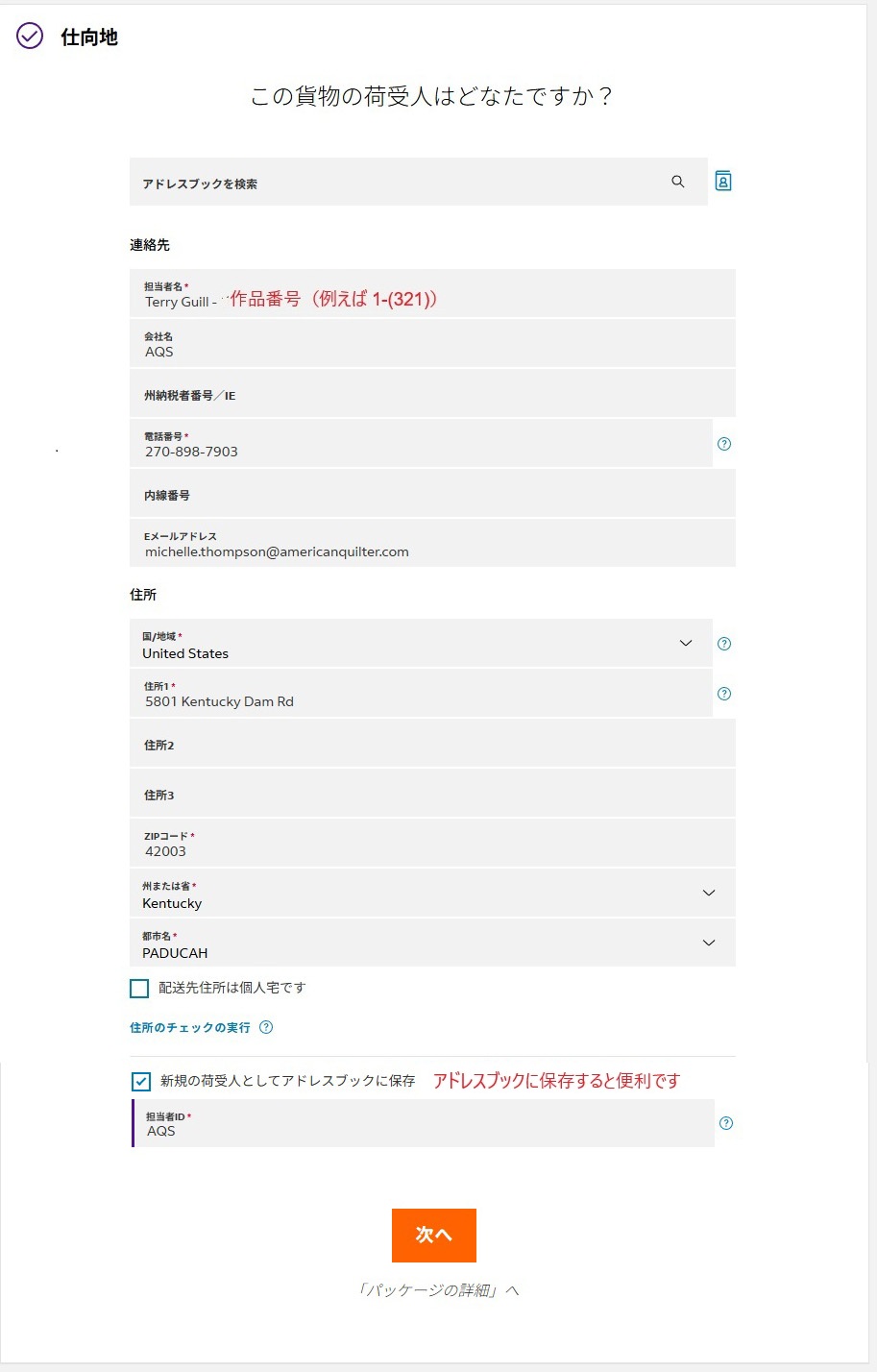 | 送り先の例 | AQS-(3-416) (←数字はメールにある作品番号) Attn: Terry Guill-PAH26 (←英数字はメールにあるもの) 5801 Kentucky Dam Rd Paducah |