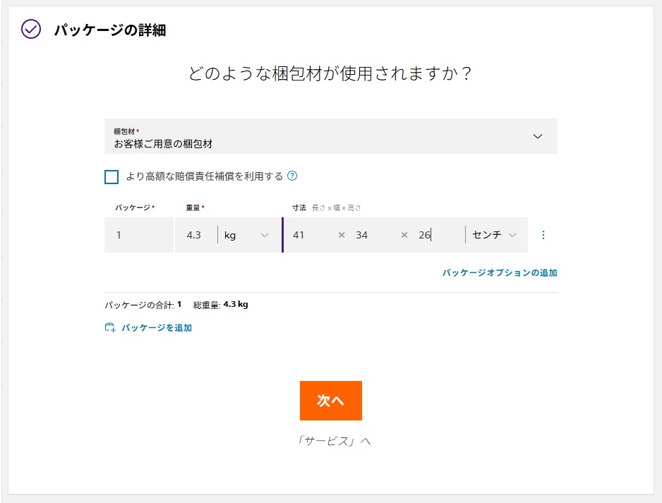 自分で用意した箱の例です。FedExの箱の場合はドロップメニューから選んでください。自分で用意した箱を使って、重量、サイズを記入した例です。