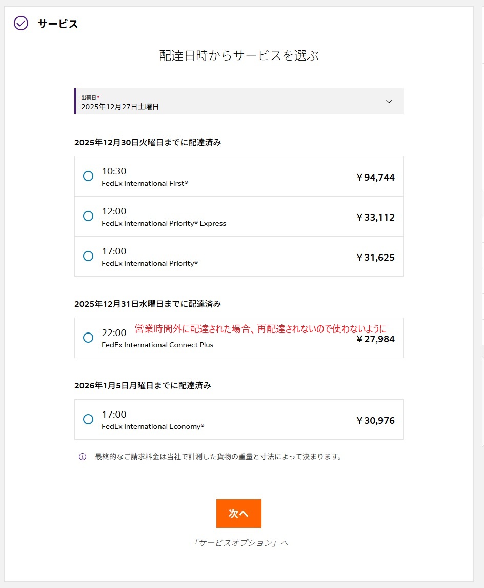 一番安いFedEx International Connect Plusは配送が1回だけで、営業時間外など不在の場合の再配達はされないとのことです。