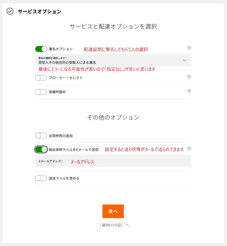 署名オプションを選んで選択します。「荷受人その他住所の受取人による署名」がふさわしいと思いますが、バグで最後にエラーになる可能性があります。
