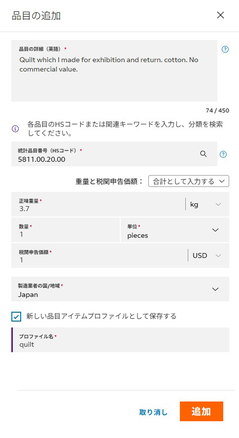 | 内容の例 | Quilt for exhibition and return. (made in Japan by sender, cotton) NO commercial value スマホを使うゆうプリタッチは文字数制限で全部入力できないのでNO commercial valueを削るなどの工夫をしてください。 |