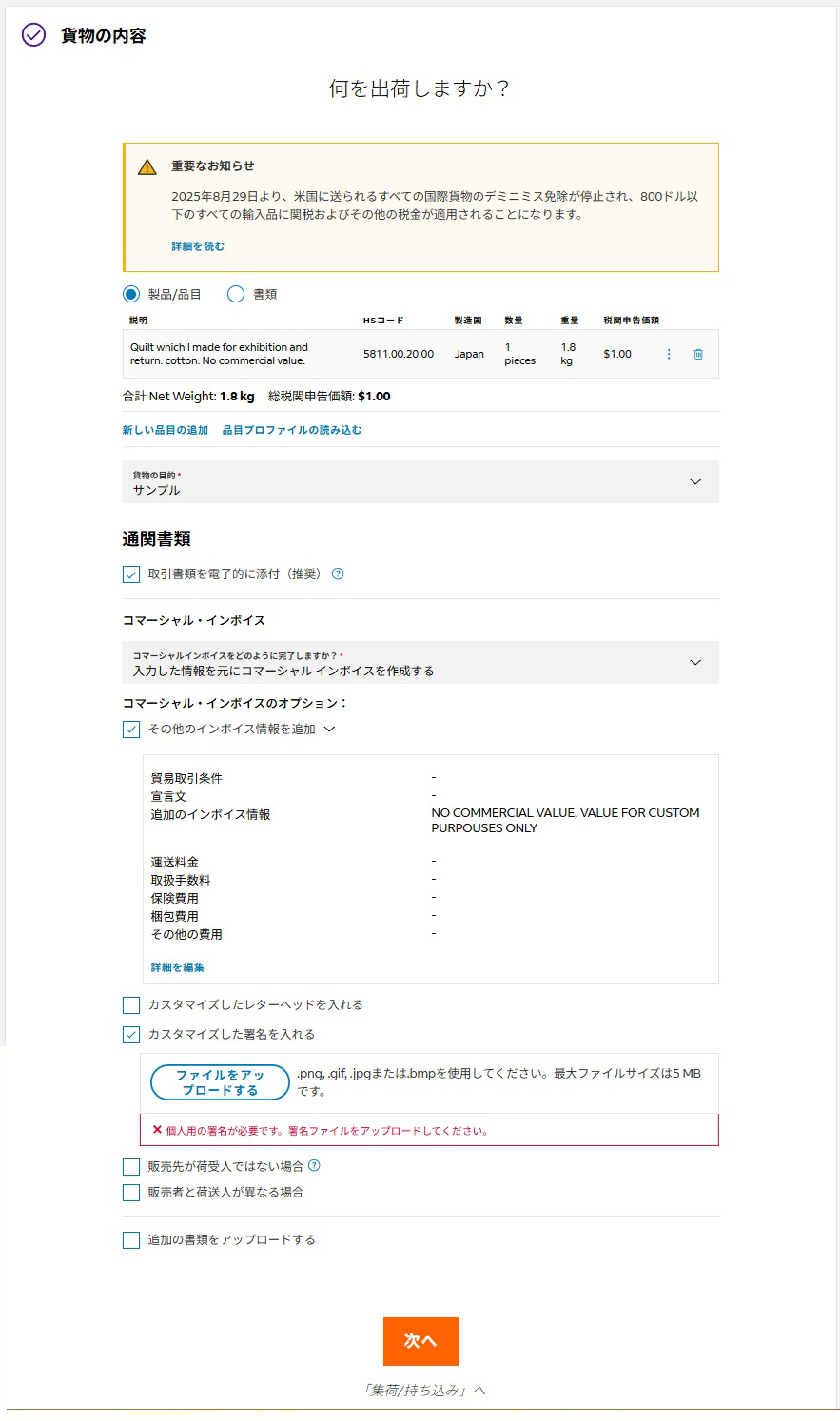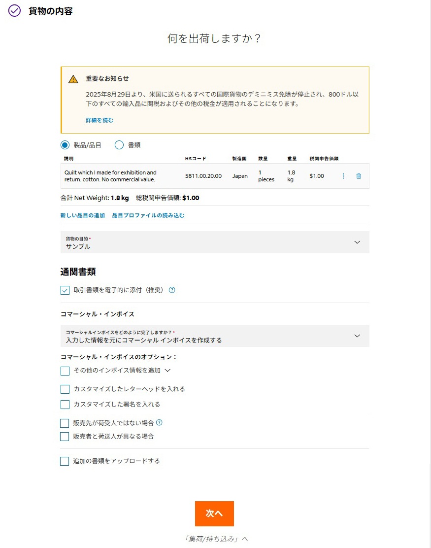 | インボイスの有償無償 | 無償にします。そうすることで、送り状やインボイスに「No commercial value for customs purpose only」と記入されます。 |