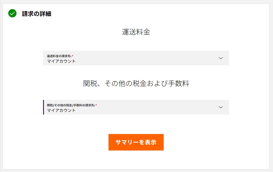 運送料金:マイアカウントになっていると思います。違う場合はマイアカウントにします。関税、その他の税金および手数料:マイアカウントにします。