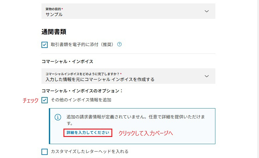 コマーシャル・インボイスのその他のインボイス情報をチェックすると入力画面が出てきます。