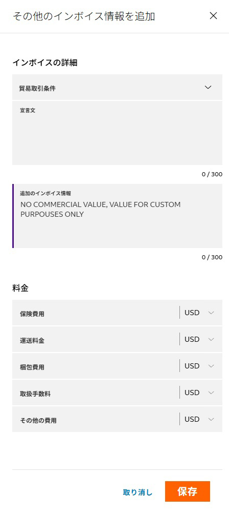 追加のインボイス情報にNO COMMERCIAL VALUE, VALUE FOR CUSTOM PURPOUSES ONLYを記入し保存を押してください。
