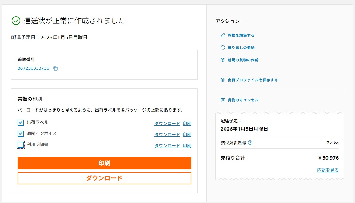必要な出荷ラベルと通関インボイスを印刷してください。ダウンロードして後ほど印刷しても構いません。
